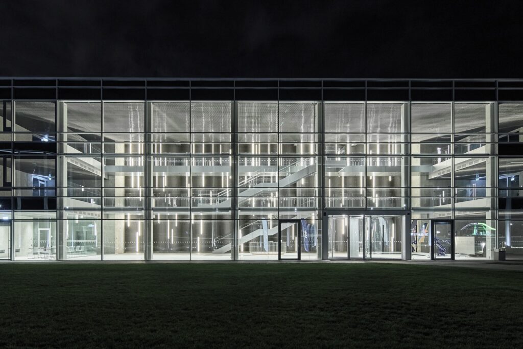 The interior continues the futuristic, industrial aesthetic: anodized aluminum ceilings, stainless steel details, and an acoustic wall made of metal tubes that simultaneously functions as an art object, a sound absorption solution, and a light installation. At night, this light becomes visible from the highway, further strengthening the building’s image as a contemporary beacon of innovation.